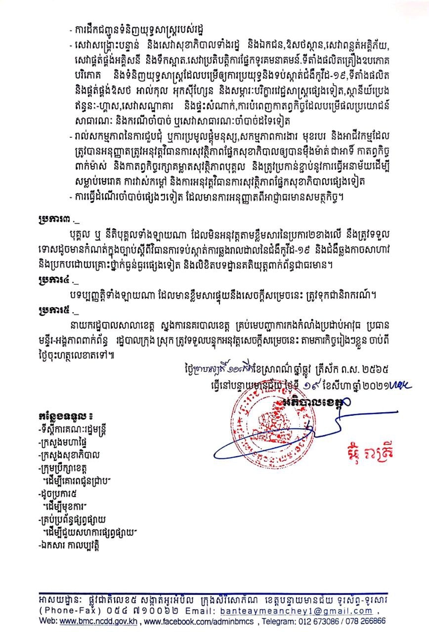 បន្ទាយមានជ័យ៖ រដ្ឋបាលខេត្តបន្ទាយមានជ័យ នៅថ្ងៃទី១៩ ខែសីហា ឆ្នាំ២០២១នេះ បានចេញសេចក្តីសម្រេច បន្តអនុវត្តវិធានការរដ្ឋបាលជាបណ្ដោះអាសន្ន ដើម្បីទប់ស្កាត់ការរីករាលដាល ជំងឺកូវីដ១៩ ក្នុងភូមិសាស្ត្រខេត្តបន្ទាយមានជ័យ រយៈពេល១សប្តាហ៍ទៀត គិតចាប់ពីថ្ងៃទី២០ រហូតដល់ថ្ងៃទី២៦ ខែសីហា ឆ្នាំ២០២១។