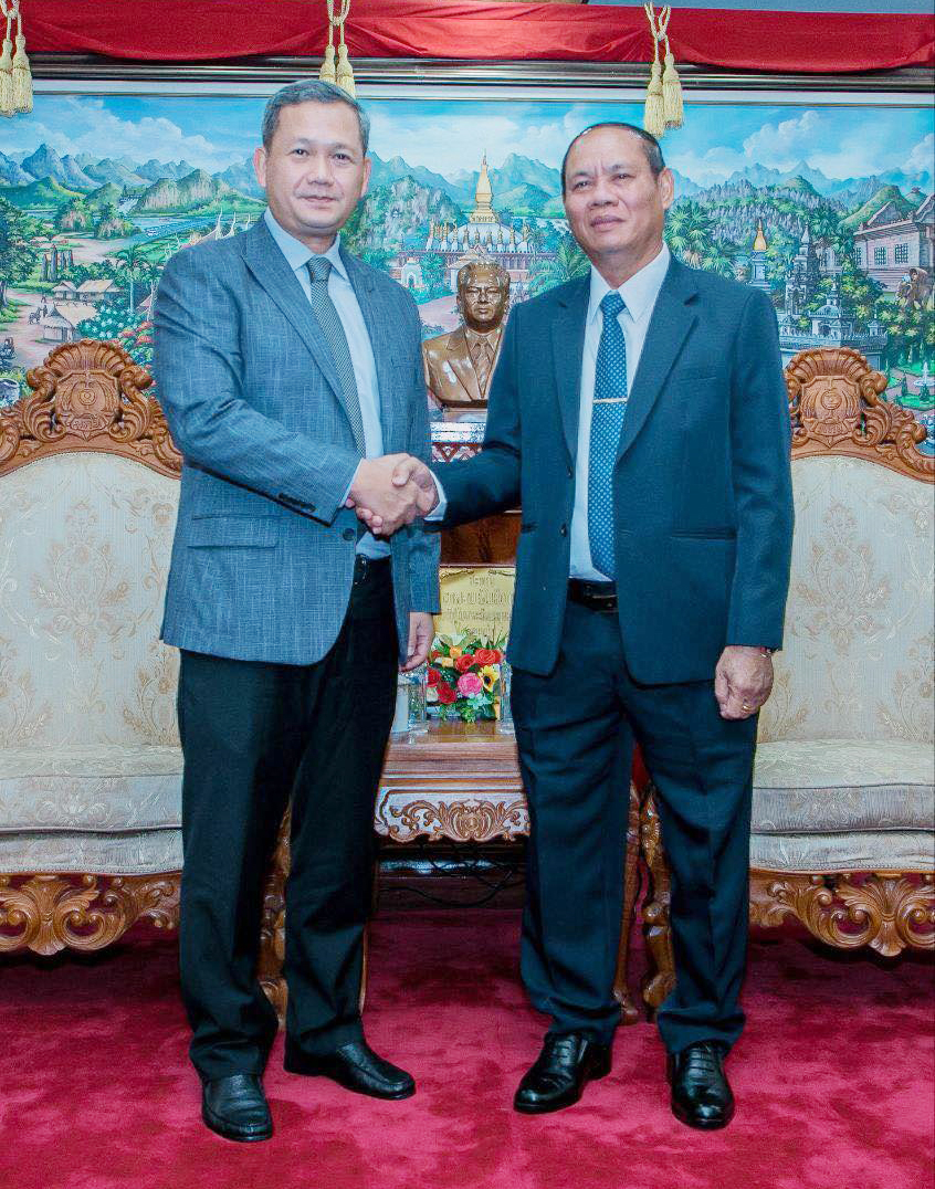 ឡាវ៖ កាលពីថ្ងៃទី៣១ ខែសីហា ឆ្នាំ២០២២ ឧត្តមសេនីយ៍ឯក ហ៊ុន ម៉ាណែត អគ្គមេបញ្ជាការរង នៃកងយោធពលខេមរភូមិន្ទ មេបញ្ជាការកងទ័ពជើងគោក បានអញ្ជើញចូលជួបសម្តែងការគួរសមជាមួយ នាយឧត្ដមសេនីយ៍ វិល័យ ឡាខាំហ្វុង ឧបនាយករដ្ឋមន្ត្រី និងជារដ្ឋមន្ត្រីក្រសួងសន្តិសុខសាធារណៈ នៃសាធារណរដ្ឋប្រជាធិបតេយ្យប្រជាមានិតឡាវ ក្នុងគោលបំណងរិតចំណងសាមគ្គីភាពរវាងប្រទេសទាំងពីរ នាឱកាសនៃដំណើរបំពេញទស្សនកិច្ចផ្លូវការនៅរដ្ឋធានីវៀងចន្ទន៍ ចាប់ពីថ្ងៃទី២៩ ដល់ថ្ងៃទី៣១ ខែសីហា ឆ្នាំ២០២២។