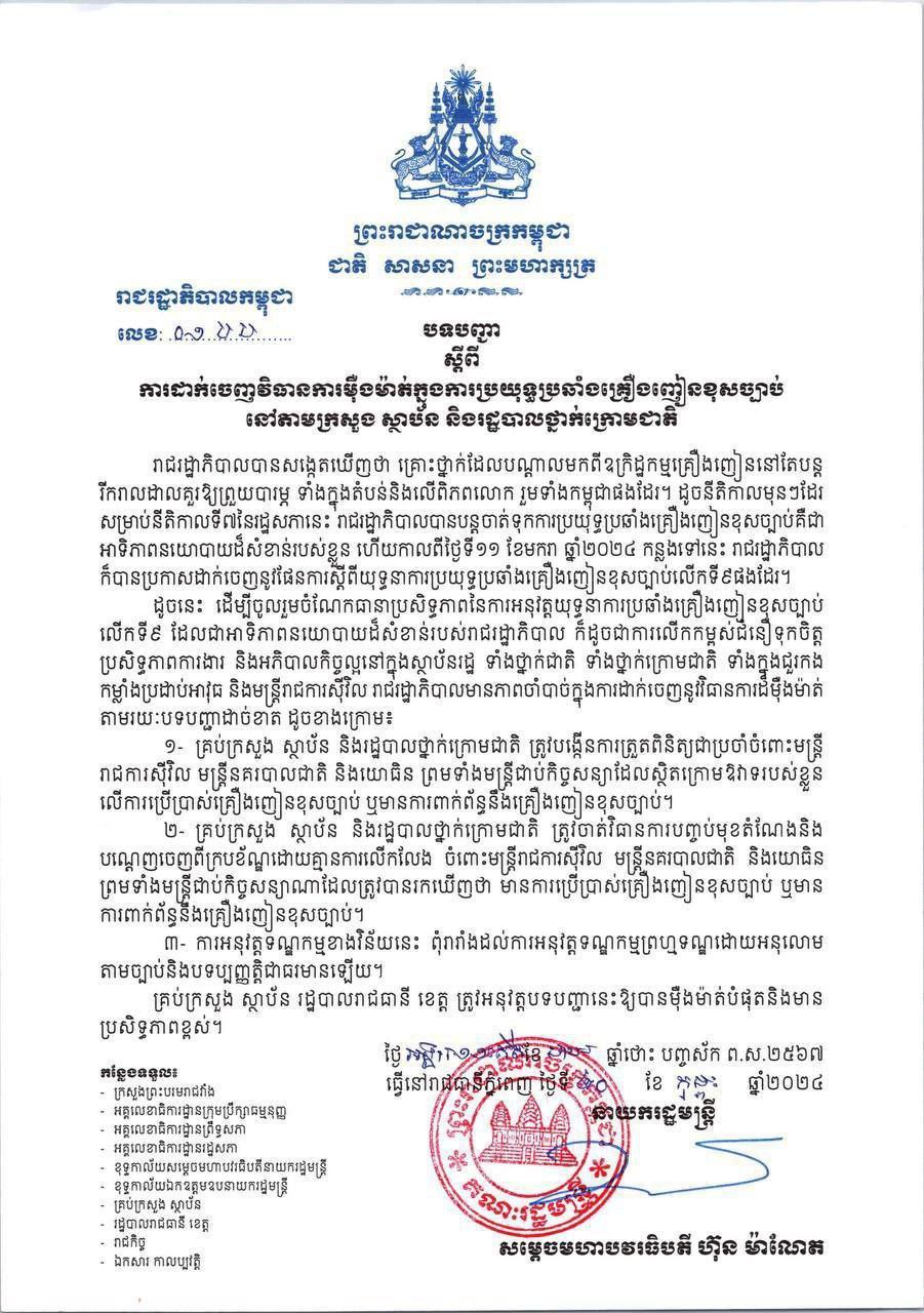 គណបក្សឯកភាពជាតិខ្មែរ ប្រកាសគាំទ្រទាំងស្រុង បទបញ្ជាដ៏ម៉ឺងម៉ាត់របស់ សម្ដេចមហាបវរធិបតី ហ៊ុន ម៉ាណែត ស្តីពីការប្រយុទ្ធប្រឆាំងគ្រឿងញៀន