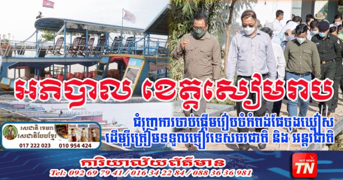 សៀមរាប៖ ឯកឧត្តម ទៀ សីហា អភិបាលខេត្តសៀមរាប កាលពីរសៀលថ្ងៃទី០៣ ខែវិច្ឆិកា ឆ្នាំ២០២១ បានដឹកនាំក្រុមការងារចម្រុះខេត្ត ចុះពិនិត្យកំពង់ផែចុងឃ្នៀស ដើម្បីរៀបចំ និង ជួសជុលកែលម្អឡើញវិញស្របតាបតាមស្តង់ដាកំពង់ផែទេសចរណ៍ ដើម្បីដាក់បម្រើសេវាកម្មសម្រាប់ភ្ញៀវទេសចរជាតិ និង អន្តរជាតិ បន្ទាប់ពីប្រមុខរាជរដ្ឋាភិបាលប្រកាសបើកដំណើរការប្រទេសឡើងវិញ ចាប់ពីថ្ងៃទី០១ ខែវិច្ឆិកា ឆ្នាំ២០២១នេះតទៅ។