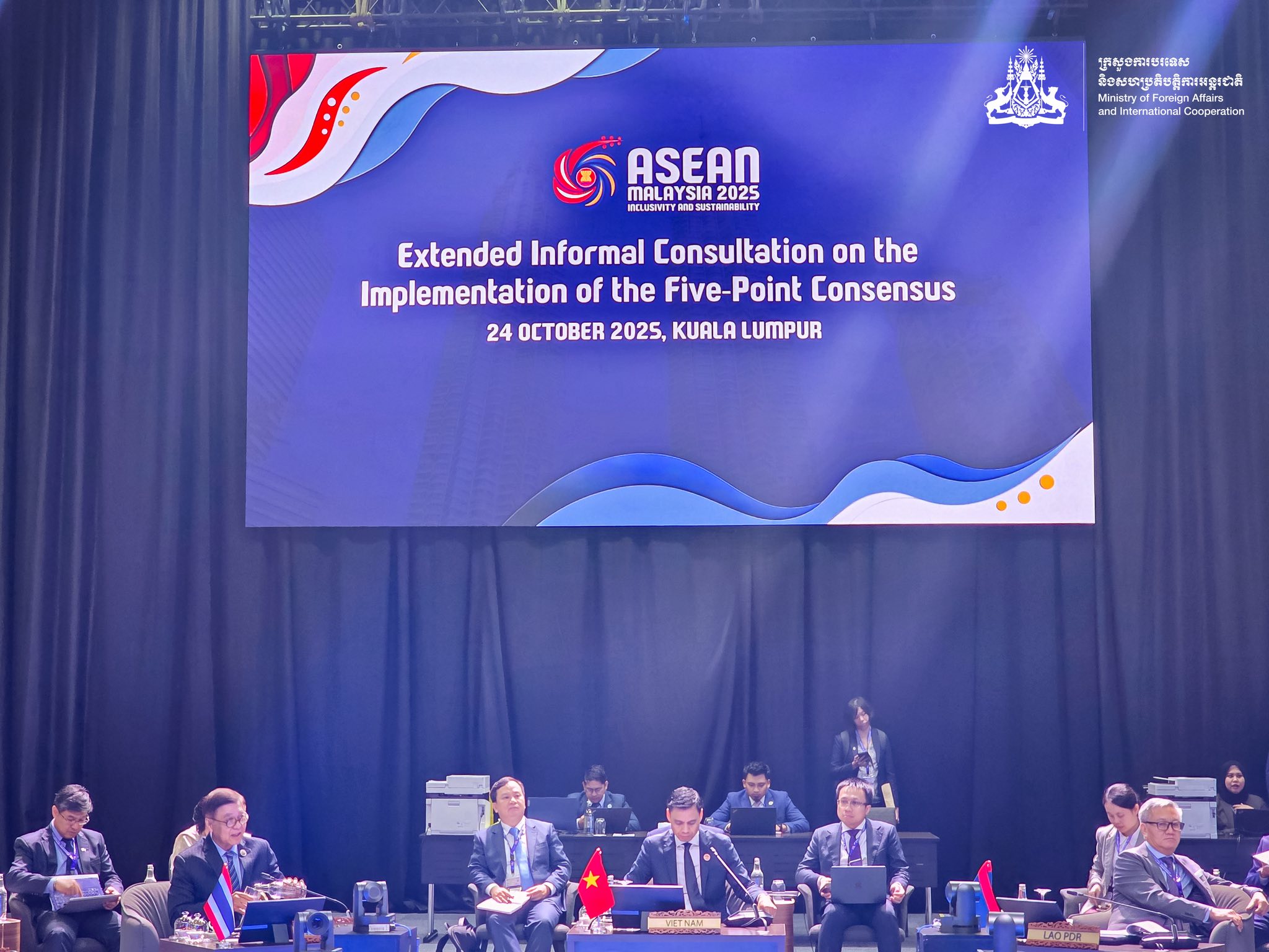 ភ្នំពេញ៖ នៅរសៀលថ្ងៃទី២៤ ខែតុលា ឆ្នាំ២០២៥ ឯកឧត្តមឧបនាយករដ្ឋមន្ត្រី ប្រាក់ សុខុន រដ្ឋមន្ត្រីការបរទេស និងសហប្រតិបត្តិការអន្តរជាតិ បានអញ្ជើញចូលរួមកិច្ចពិគ្រោះយោបល់ក្រៅផ្លូវការក្នុងទម្រង់ពង្រីក នៅទីក្រុងគូឡាឡាំពួ ប្រទេសម៉ាឡេស៊ី។ កិច្ចពិគ្រោះយោបល់នេះបានគូសបញ្ជាក់ពីការប្តេជ្ញាចិត្តរបស់អាស៊ានចំពោះកិច្ចព្រមព្រៀងជាឯកច្ឆន្ទប្រាំចំណុច (5PC) ដើម្បីសន្តិភាព និងដំណោះស្រាយយូរអង្វែងនៅមីយ៉ាន់ម៉ា។