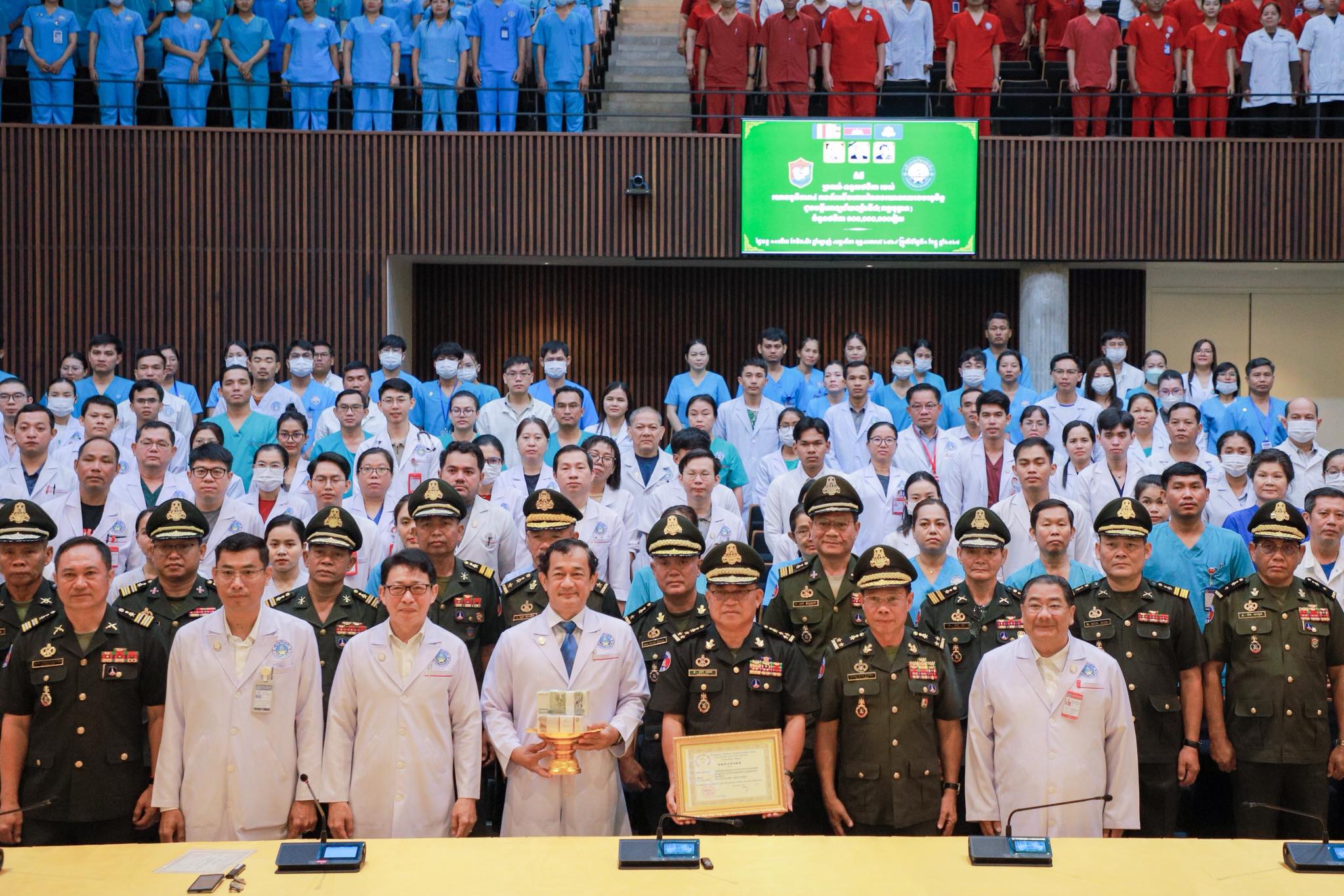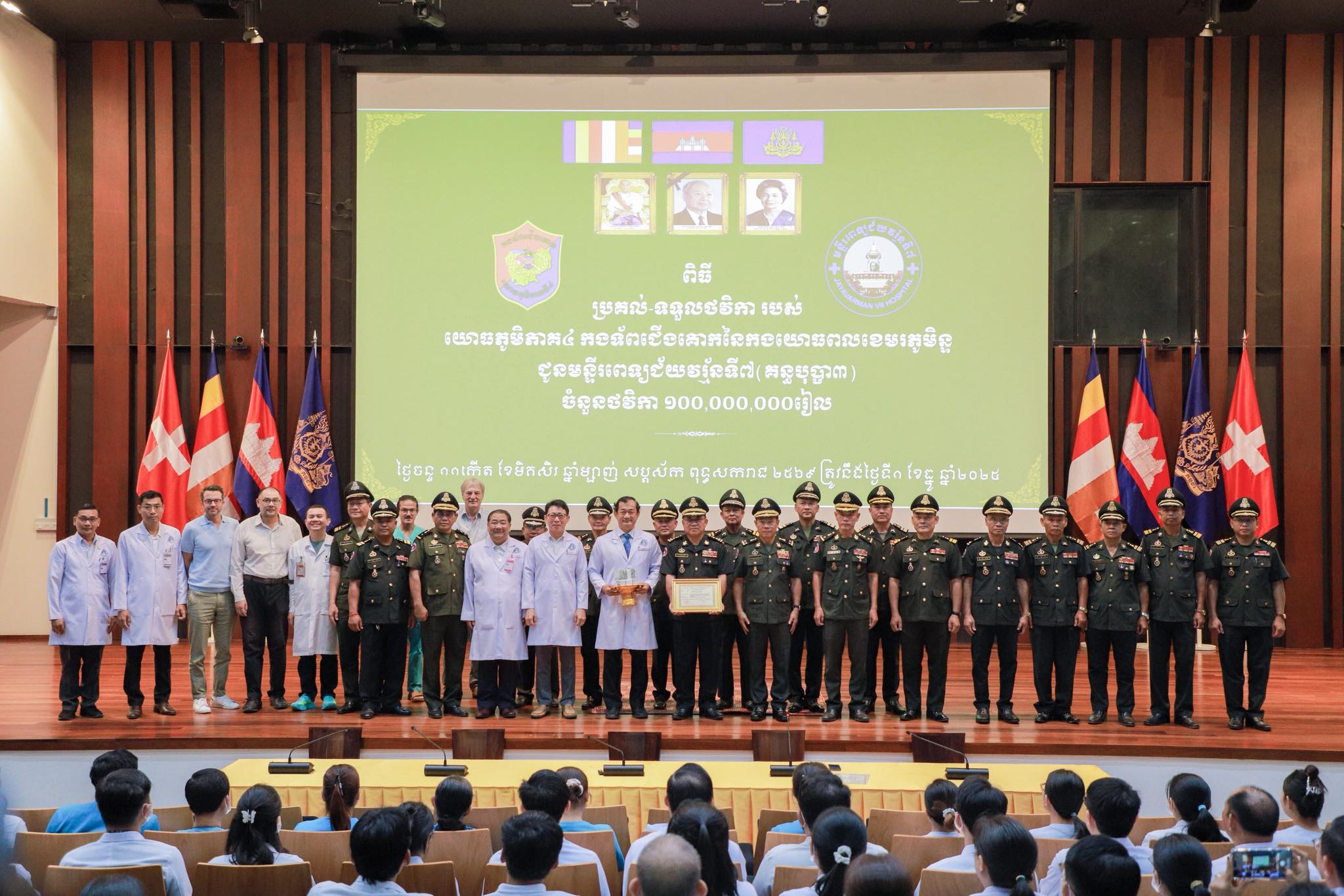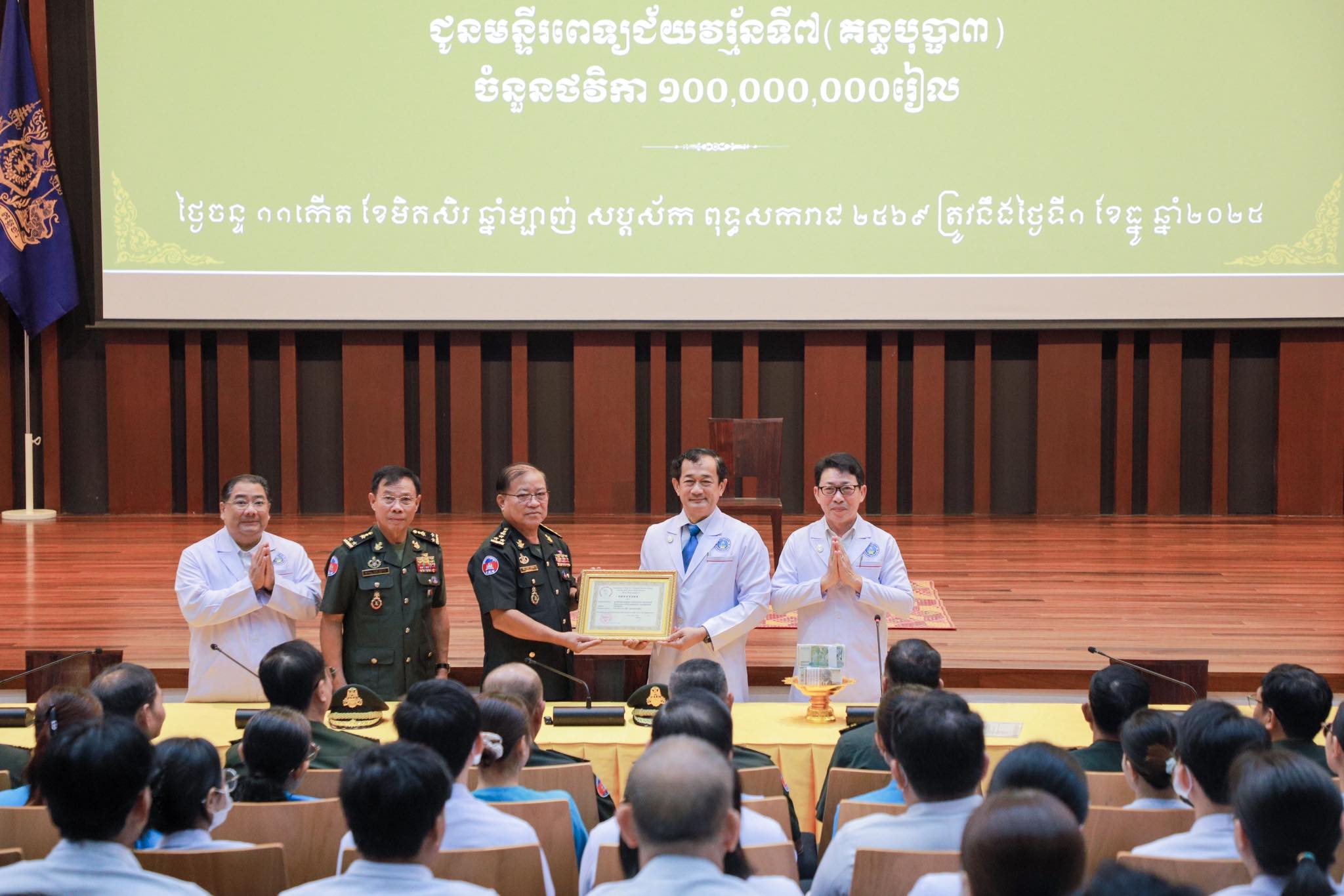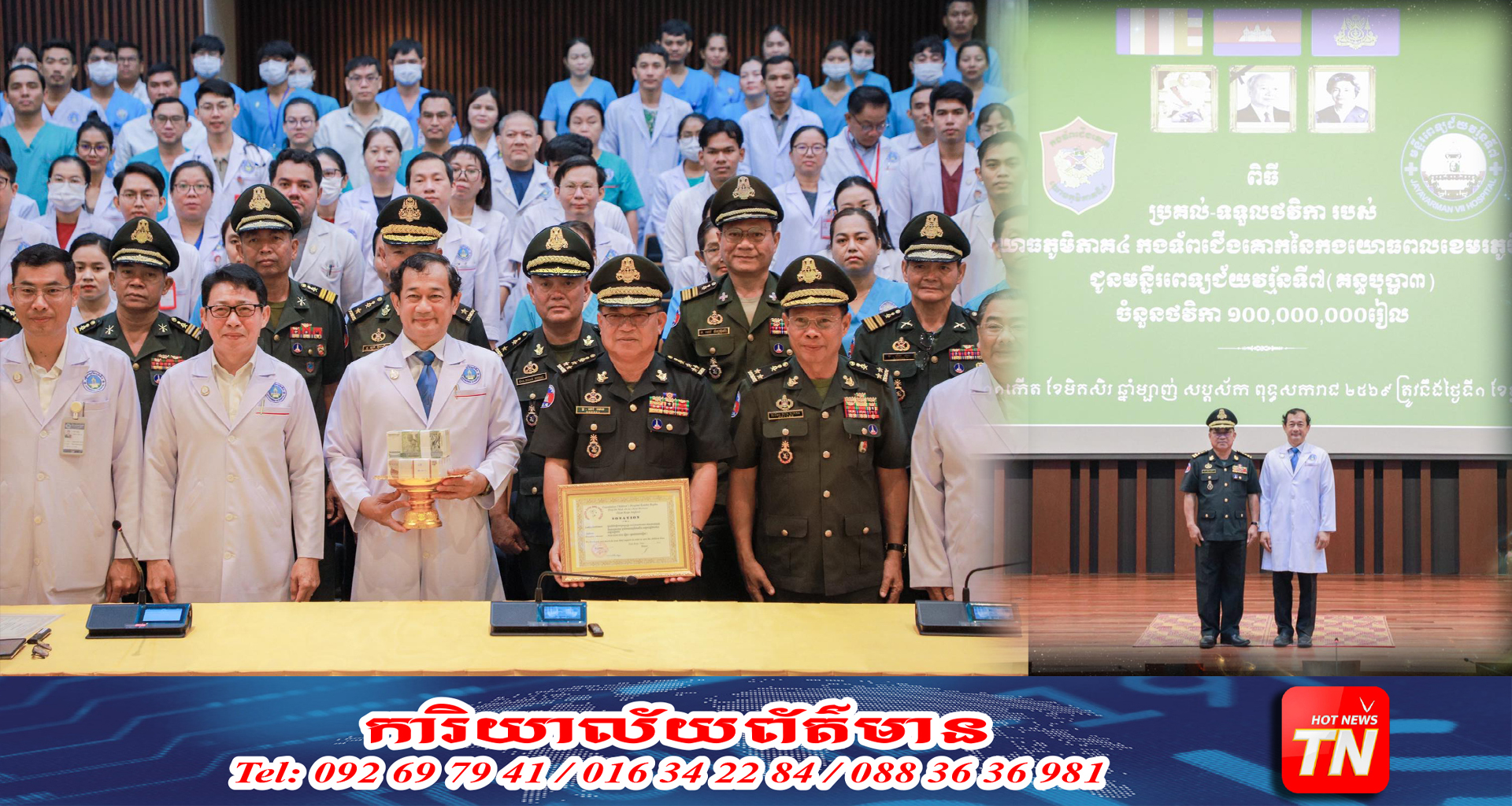 សៀមរាប៖ ឯកឧត្តម ឧត្តមសេនីយ៍ឯក ពៅ ហេង មេបញ្ជាការរងកងទ័ពជើងគោក និងជាមេបញ្ជាការយោធភូមិភាគ៤ នៅព្រឹកថ្ងៃទី១ ខែធ្នូ ឆ្នាំ២០២៥ បាននាំយកថវិកាចំនួន ១០០,០០០,០០០ រៀល (មួយរយ លានរៀន)ដែលទទួលបានពីវិភាគទានប្រចាំឆ្នាំរបស់នាយទាហាន នាយទាហានរង និងពលទាហាន មកបរិច្ចាគជូន មន្ទីរពេទ្យជ័យវរ្ម័នទី៧ (គន្ធបុប្ផា សៀមរាប)។