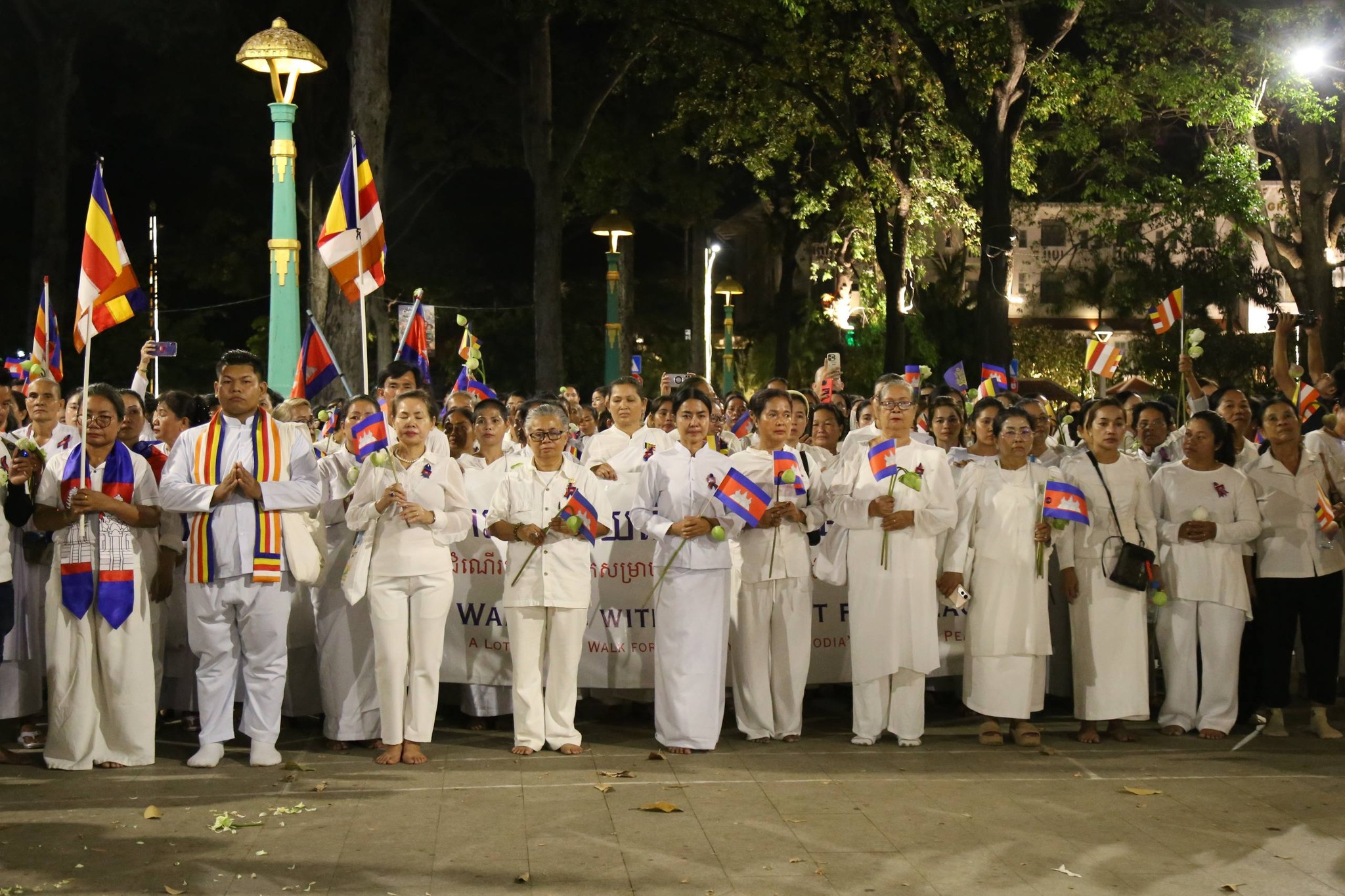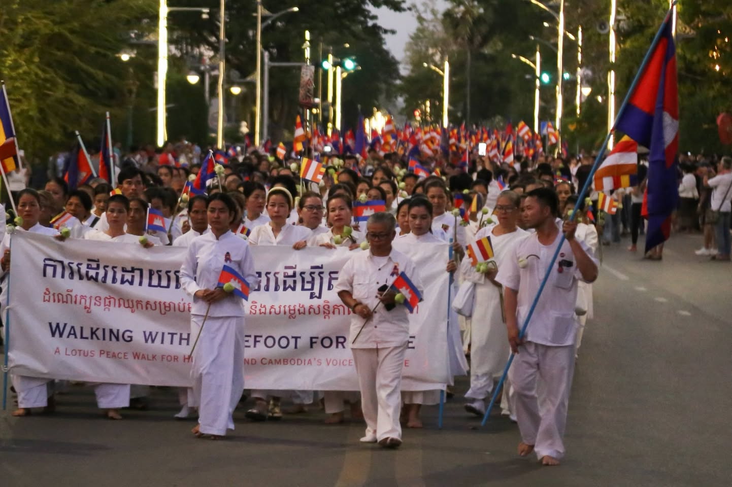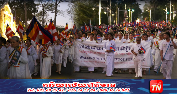 សៀមរាប៖ ប្រជាជនខ្មែរជាច្រើនរយនាក់ បានជួបជុំគ្នានៅសួនច្បារជិតព្រះរាជដំណាក់ក្រុងសៀមរាបដើម្បីចូលរួមពិធី «ដើរដោយជើងទទេដើម្បីសន្តិភាព» ដែលជាដំណើរក្បួនសន្តិភាពសាធារណៈមួយដោយអហិង្សា ដែលមានគោលបំណងផ្ញើសារដ៏មានអត្ថន័យទៅកាន់សហគមន៍អន្តរជាតិ ថា កម្ពុជាគឺជាប្រទេសដែលគាំទ្រសន្តិភាព សេចក្តីថ្លៃថ្នូរ និងការពារជីវិតមនុស្ស។ នេះបើយោងតាម AKP ។